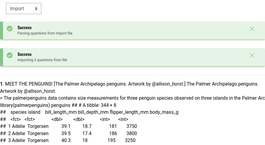 ---In this case the questions will be imported into the ‘penguins’ category, with only 1 replicate for each question (the default).