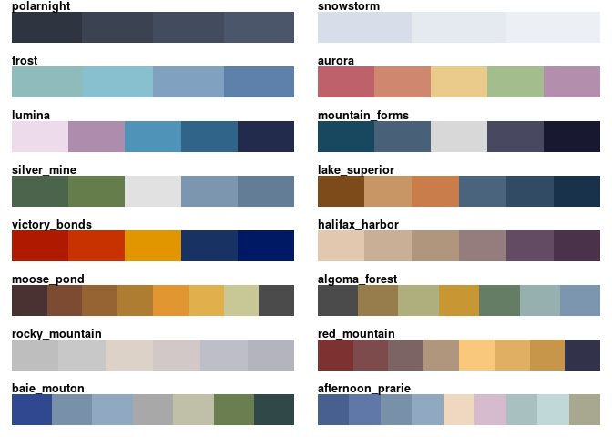I started building this package long ago, as part of my own personal utility packages, as I have been using the nord palettes from ArcticIce Studioes for quite some time. A few months ago, I read something on the interwebs stating that work you did that was still private was pretty much a waste, so share it openly. That struck a chord. Then I read Maelle Salmon’s “How to Develop Good R Packages (for open science)”, and was introduced to usethis, styler and goodpractice. That was the catalyst for making this package.