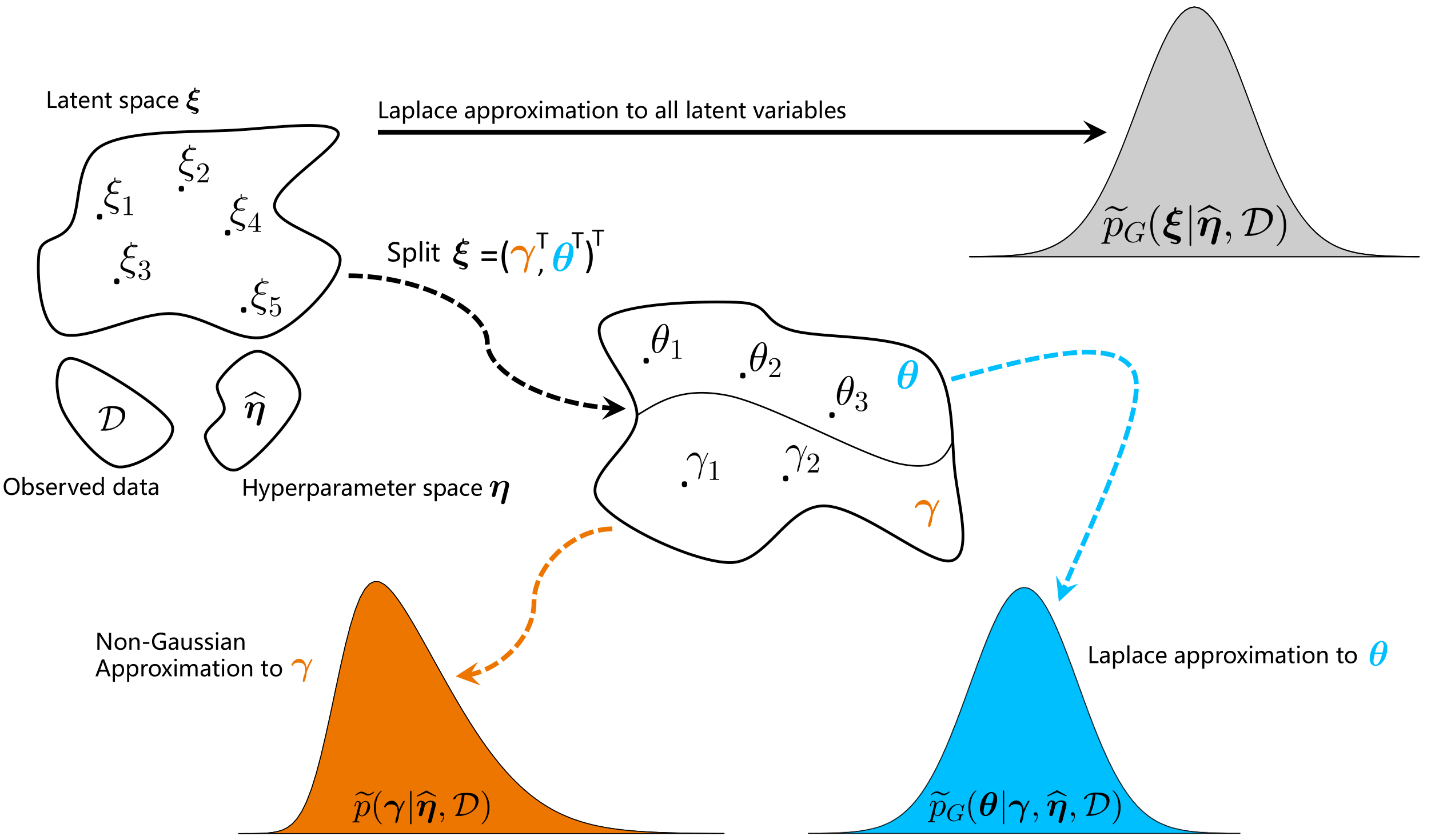 We propose a refined version of the LPS methodology by splitting the parameter space in two subsets, \(\pmb{\zeta}=(\pmb{\gamma}^\top,\pmb{\theta}^\top)^\top\) . The first set involves the non-penalized parameters \(\pmb{\gamma}\) for which the joint posterior distribution \(p(\pmb{\gamma}|\pmb{\lambda},{\cal D})\) is approached from a non-Gaussian perspective with an approximation scheme tailored to capture asymmetry and kurtosis, while the conditional posterior distribution \(p(\pmb{\theta}|\pmb{\gamma},\pmb{\lambda},{\cal D})\) for the penalized parameters \(\pmb{\theta}\) in the complementary set undergoes the LPS treatment with Laplace approximations, see Fig.1 (with \(\pmb{\eta}=\pmb{\lambda}\)).
