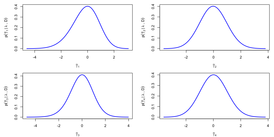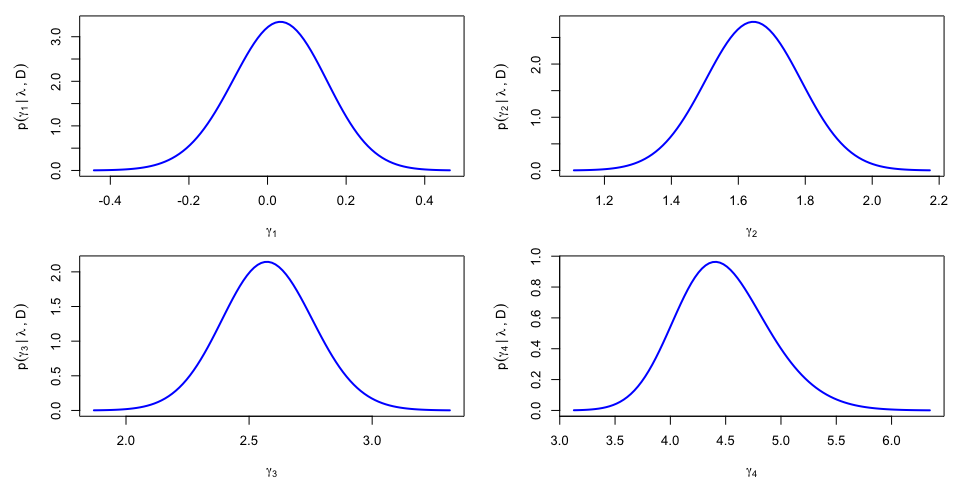 The results can be re-expressed in the original parametrization, yieding \(p(\gamma_k|\lambda,{\cal D})\) and a noticable asymmetry for the posterior density of \(\gamma_4\):