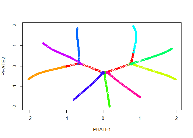 This is a basic example running phate on a highly branched example dataset that is included with the package. You can read a tutorial on running PHATE on single-cell RNA-seq at http://htmlpreview.github.io/?https://github.com/KrishnaswamyLab/phateR/blob/master/inst/examples/bonemarrow_tutorial.html or in inst/examples. Running this tutorial from start to finish should take approximately 3 minutes.