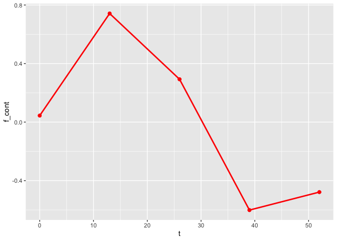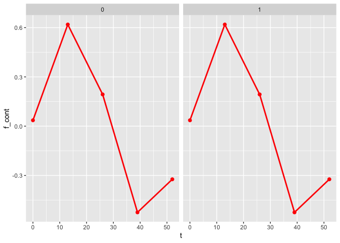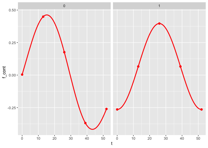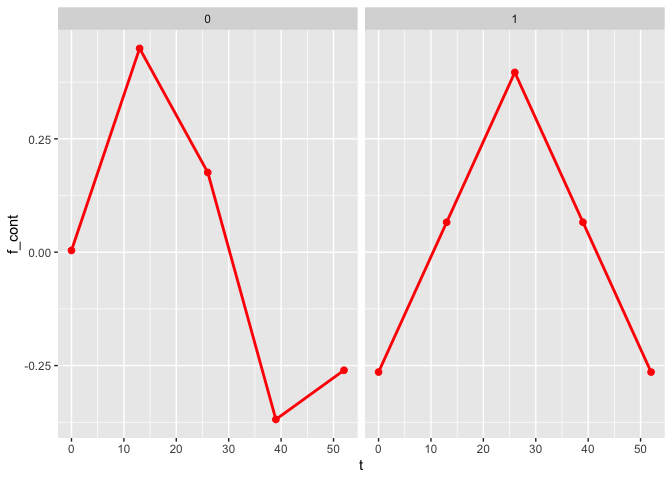 Finally, we can perform tests on the nonlinear functions. The first element of the list is an overall test of equality. If the p-value is \(< 0.05\), we reject the null hypothesis of equality and conclude that overall the two nonlinear functions are different. To obtain a comparison at each time point, confidence bands are computed, and a figure displaying these confidence bands is generated. For the time points associated with confidence bands that include \(0\), we cannot reject the null hypothesis that the nonlinear functions are the same for this time point. The data frame that is used to generate this figure can be found in the second element of the output list.