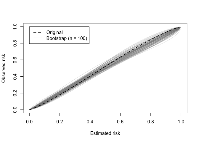 The other available methods for calculating bias corrected performance are the simple bootstrap (boot_simple), 0.632 bootstrap optimism (.632), optimism via cross-validation (cv_optimism), and regular cross-validation (cv_average). Please see ?pminternal::validate and the references therein. Bias corrected calibration curves can also be produced (see pminternal::cal_plot). Confidence intervals can also be added via confint.