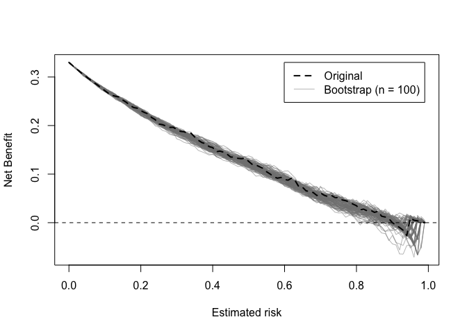 Decision curves implied by the original and bootstrap models can also be plotted.