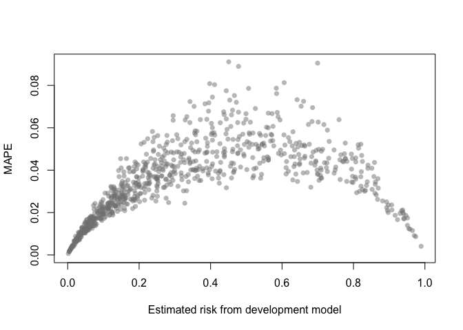 A MAPE plot shows the mean absolute prediction error, which is the difference between the predicted risk from the development model and each of the B bootstrap models.