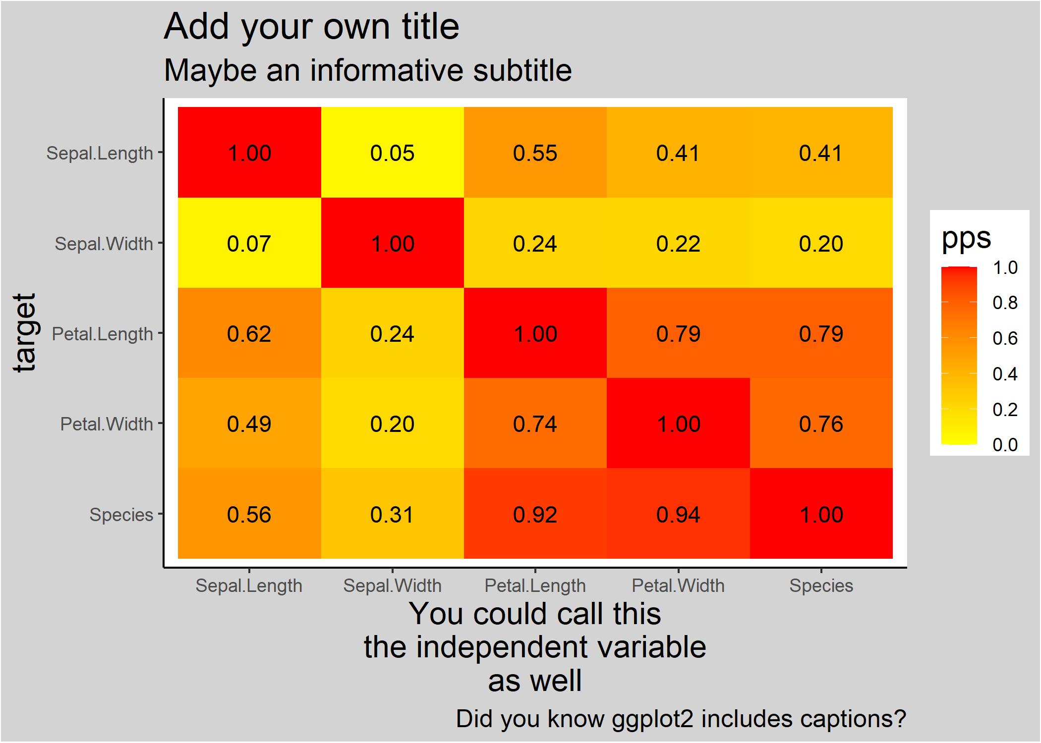 #> 1 Sepal.Length Sepal.Length predictor and target are the same 1.00000000