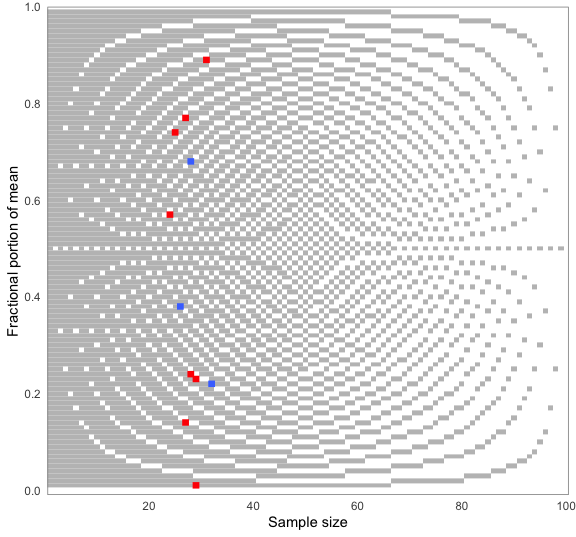 You can choose how the means are reconstructed for testing — below, rounded up from 5. When visualizing results, the plot will adjust automatically. Blue dots are consistent values, red dots are inconsistent ones: