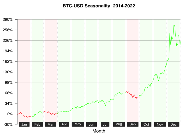 #Plot an averaging seasonality of Bitcoin (BTC-USD) between 2017 and 2022.