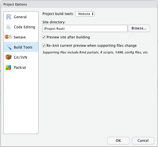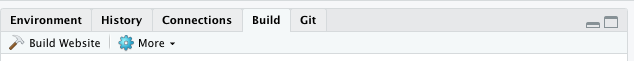 Add an empty YAML file named _site.yml, which will be populated by siteymlgen according to your file names and input options supplied to init(). ?pkgdown::build_site() Set up build tools so that you can build an R markdown website and then “Build Website”: