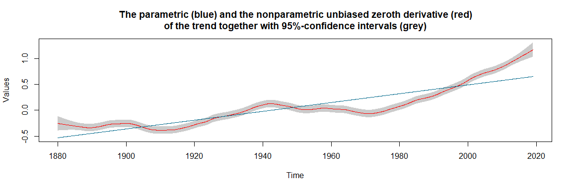 #> 97.5% 1.4614144 1.5021152 1.5267873 1.5427297 1.5536445Another contribution that was made to package version 1.1.0 is a function for testing the trend graphically for linearity. Based on a previously obtained nonparametric estimate of the trend or its derivatives, an asymptotically unbiased series of estimates with its confidence bounds is obtained and plotted. By choice, different polynomial regression lines can be displayed alongside the nonparametric trend estimates and its confidence bounds. The estimated slope of a simple linear regression model of the trend and the constant with value zero are displayed against the estimates of the first and second derivatives, respectively. If, for a selected confidence level 100s%, clearly more than (1 - s)100% of the estimated parametric line lies outside of the confidence bounds, the null hypothesis can be rejected. The following example is based yet again on the mean monthly temperature changes data and illustrates the linearity test with respect to the nonparametric trend. The derivatives are skipped at this point for simplicity. Moreover, a confidence level of 95% was chosen.