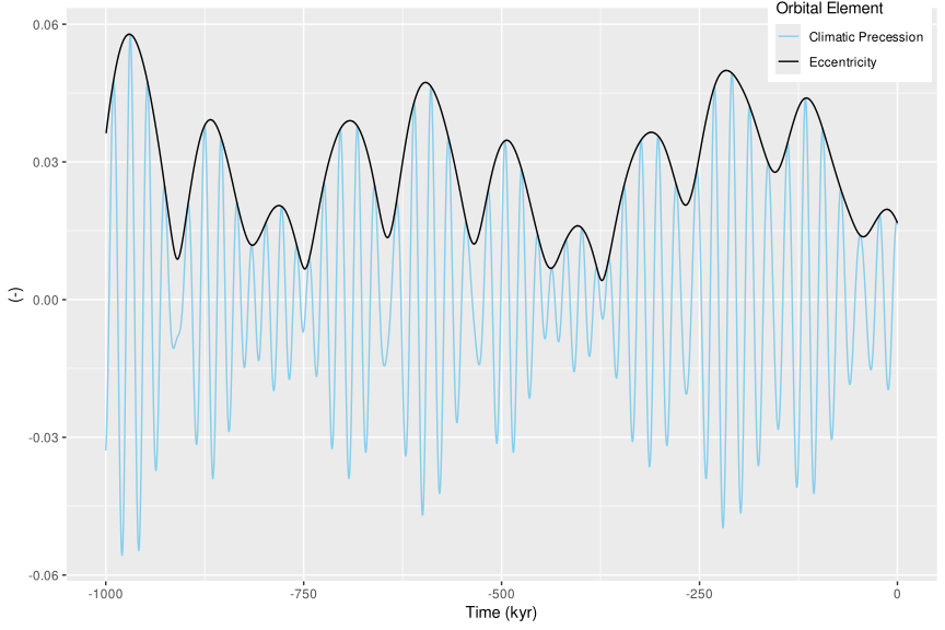 labs(x = "Time (kyr)", y = "(-)", colour = "Orbital Element") +
