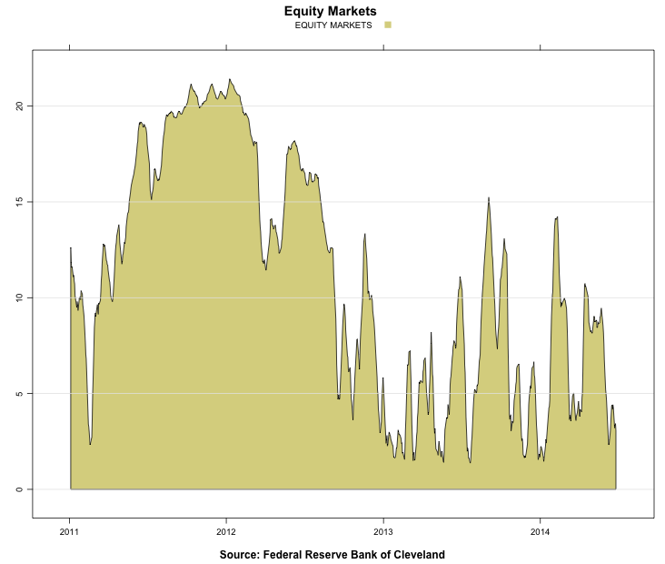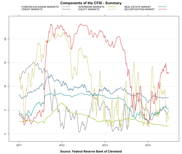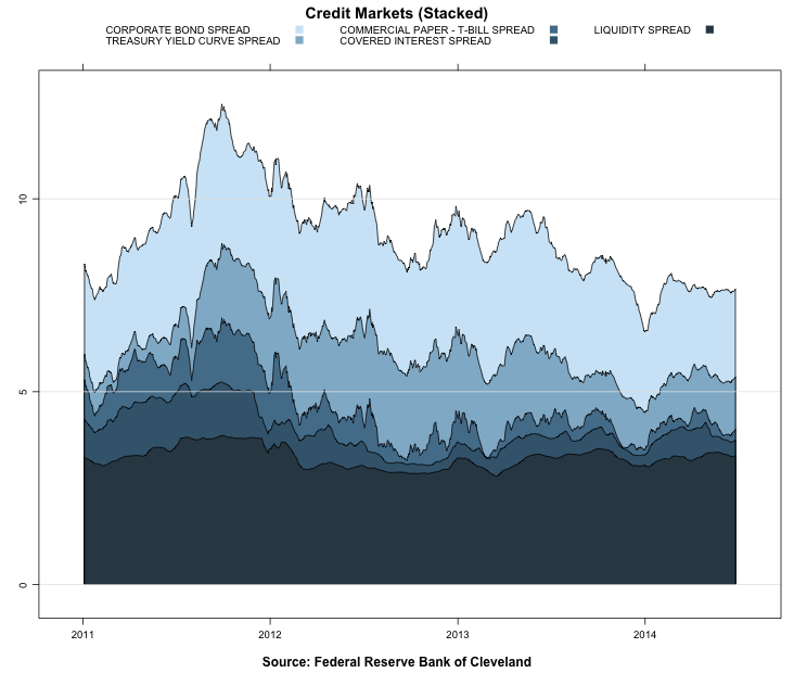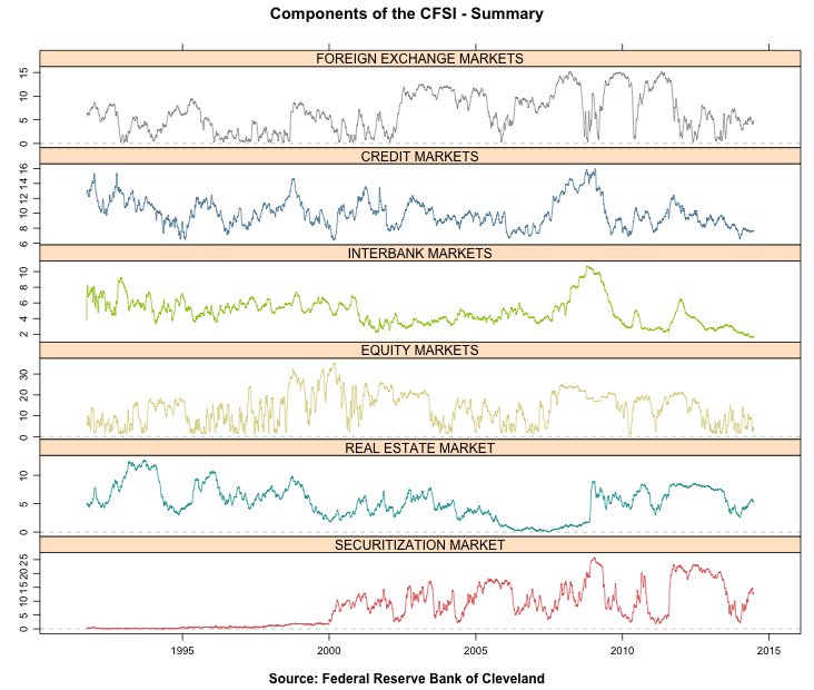 The R package stressr provides convenient access to the financial stress index and components data provided by the Federal Reserve Bank of Cleveland. The package provides data download functions and some representative plots along the same categories as provided by the bank. See the FRB’s terms of use regarding these data.