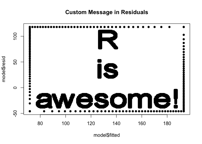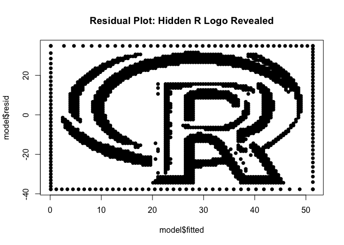 Ever wanted to hide secret messages or images in your data? That’s what the surreal package does! It lets you create datasets with hidden images or text that appear when you plot the residuals of a linear model by providing an implementation of the “Residual (Sur)Realism” algorithm described by Stefanski (2007).