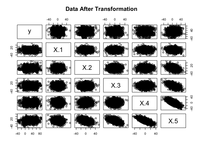 pairs(y ~ ., data = transformed_data, main = "Data After Transformation")