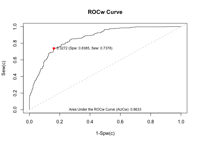 If you want to draw the optimal cut-off point in the ROC curve, then use the function wroc.plot() and indicate the method by means of the argument cutoff.method in the function wroc() as follows: