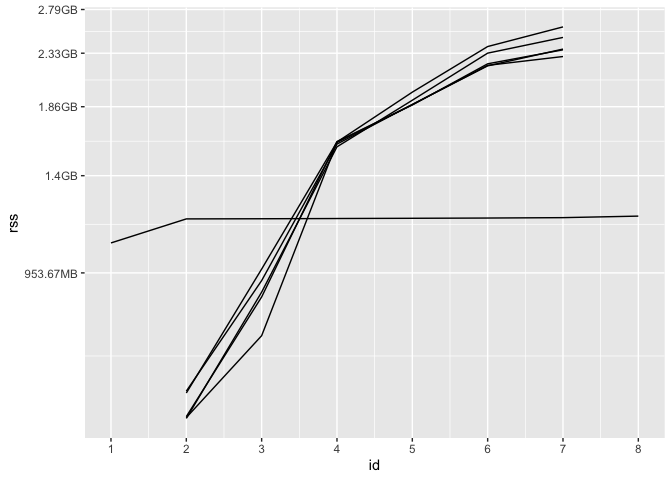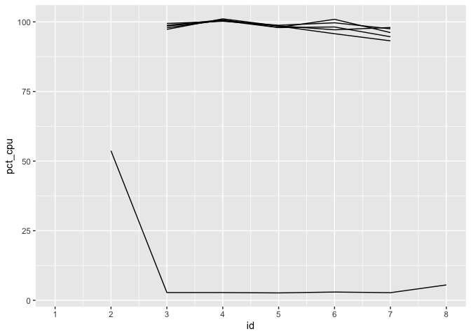 Results from syrup only provide enough detail for the coarsest analyses of memory and CPU usage, but they do provide an entry point to “profiling” system resource usage for R code that runs in parallel.