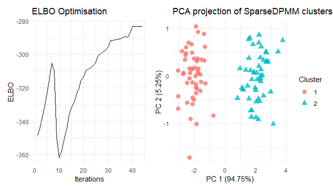 res <- cvi_npmm(X, variational_params = 20, prior_shape_alpha = 0.001,