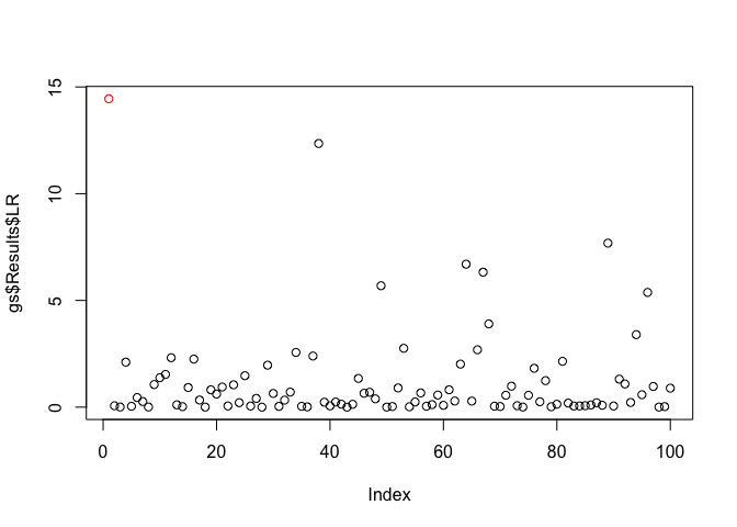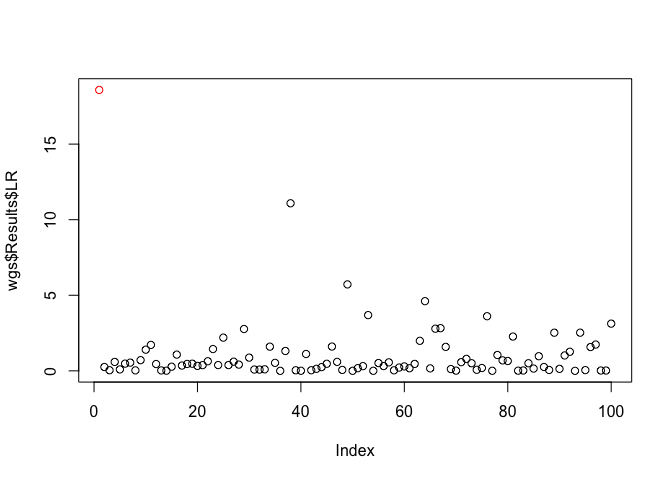 plot(x = wgs$Results$LR, col = c('red', rep('black', 99)))