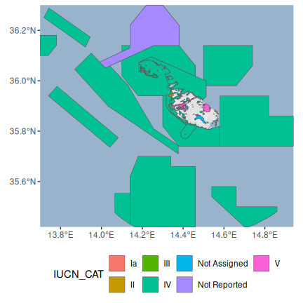 geom_sf(aes(fill = IUCN_CAT), data = mlt_pa_data, inherit.aes = FALSE) +