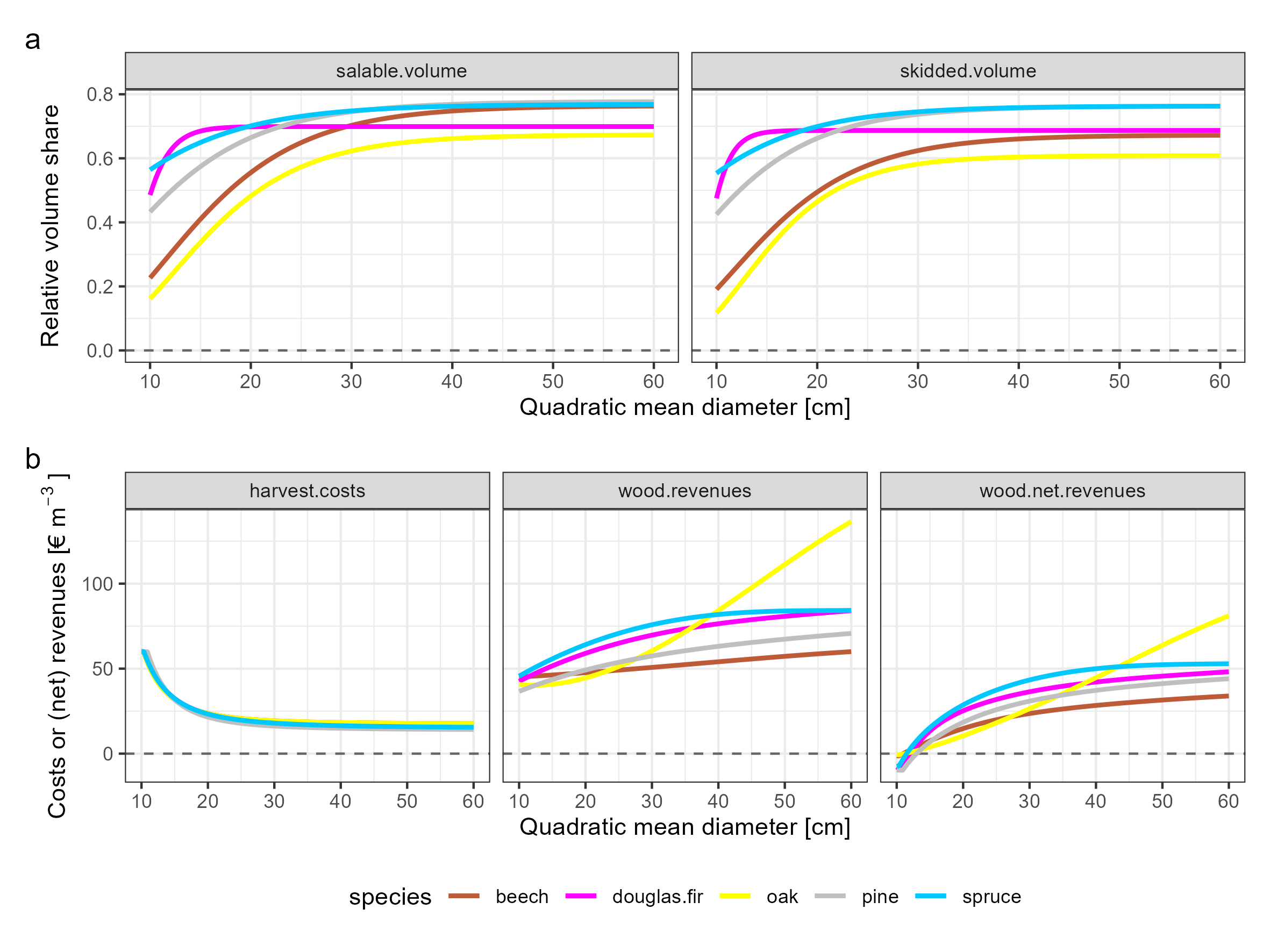 Accordingly, wood_revenues() estimates the revenues per cubic meter of salable wood [EUR m-3] and harvest_costs() the harvest costs per cubic meter of skidded wood [EUR m-3]. Both models depend on the tree species and quadratic mean diameter3 of the harvested trees. Further function arguments are the stand quality, the logging method, and the accessibility of the stand for logging operations. In addition, current market situations can be considered via updated prices for the German reference assortments.