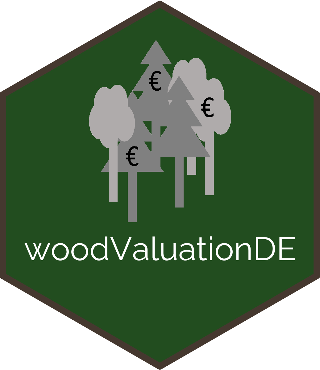 woodValuationDE comprises data and models obtained from several studies. It makes previously published models available for future studies by creating a consistent valuation framework since all1,2 submodels are based on operational harvest and sale data from HessenForst, the public forest service of the Federal State of Hesse in Germany. The underlying assortment tables are taken from Offer and Staupendahl (2018) with corresponding functions for the harvest quantities derived in Fuchs et al. (2023). Wood revenue and harvest cost functions were taken from v. Bodelschwingh (2018). The consequences of disturbances refer to Dieter (2001)1, Möllmann and Möhring (2017)2, Fuchs et al. (2022a), and Fuchs et al. (2022b).
