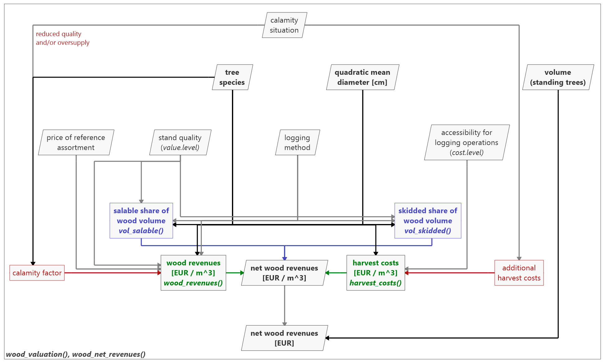 Fig. 1: Structural outline of woodValuationDE with user input and output as well as the main functions. Font: bold: main elements, italics: functions. Color: blue: function derived in Fuchs et al. (2023) based on Offer and Staupendahl (2018), green: functions taken from v. Bodelschwingh (2018), red: calamity factors derived in Dieter (2001), Möllmann and Möhring (2017), and Fuchs et al. (2022a, 2022b). Box shape: rectangle: functions and factors, parallelogram: user input and output.