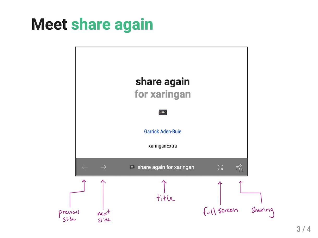 Share your slides in style with share again! It adds a share bar to your slides that only shows up when they’re embedded in another page. The bar adds easy slide navigation, quick access to full screen views, and a share menu for one-click (or tap!) sharing on social media sites.